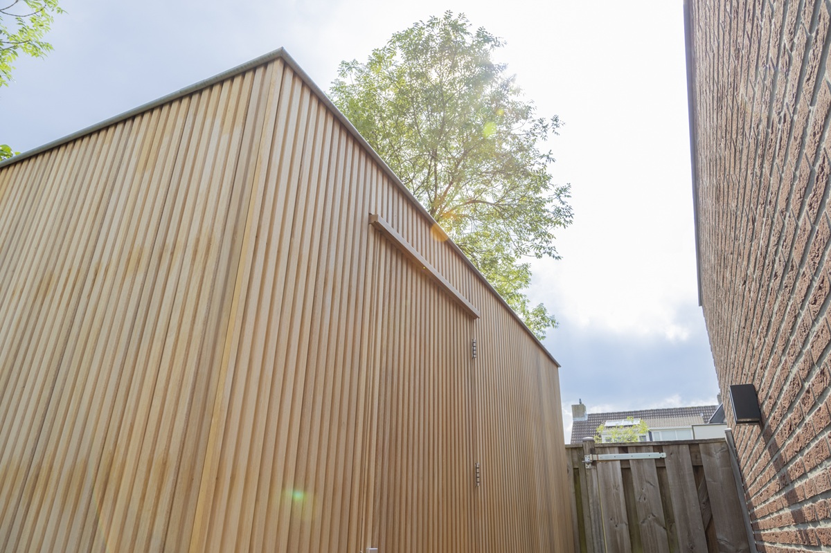 Voor deze locatie hebben wij een berging gerealiseerd waarin functionaliteit en strak design samenkomen. Het ontwerp kenmerkt zich door heldere lijnen en een hoogwaardige afwerking, waarbij de deur volledig opgaat in het totaalbeeld en nauwelijks zichtbaar is. Hierdoor ontstaat een rustig en krachtig geheel.